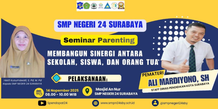 Surabaya, 14 November 2025 — SMP Negeri 24 Surabaya sukses menyelenggarakan Seminar Parenting bertajuk “Membangun Sinergi antara Sekolah, Siswa, dan Orang Tua” yang digelar pada hari Jumat, 14 November 2025 di Masjid An Nur sekolah. Acara ini menghadirkan narasumber utama Bapak Ali Mardiyono, S.H., staf Dinas Pendidikan Kota Surabaya, serta dihadiri aktif oleh orang tua/wali murid, guru, dan tenaga kependidikan.