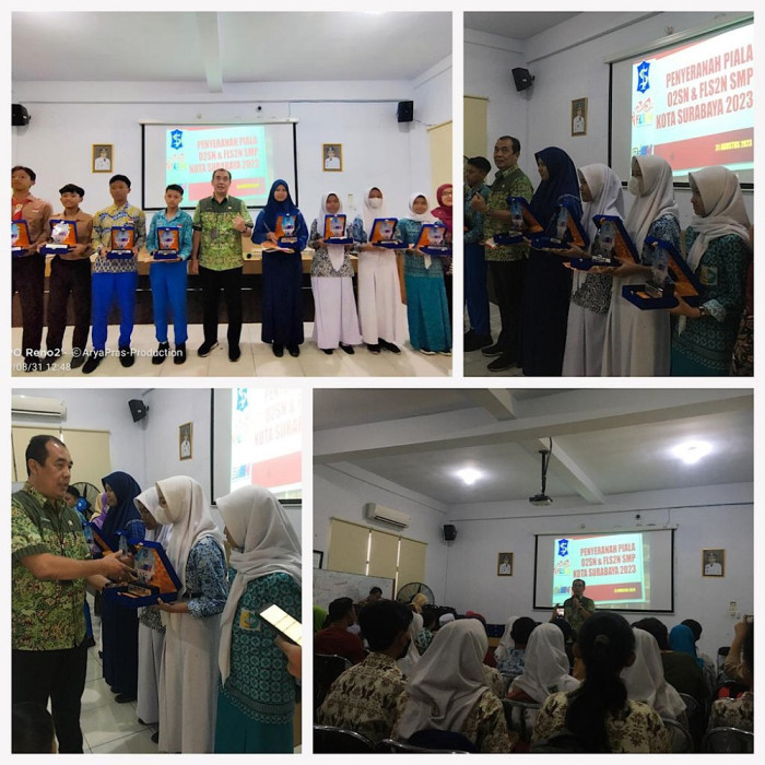 SURABAYA, kamis, 31 agustus 2023 Jenisa Bunga 9D Siswa SMPN 24 Surabaya menerima Piala O2SN di Kantor Dinas Pendidikan Kota Surabaya setelah menjadi juara 3 lomba bulu tangkis putri tingkat Kota Surabaya