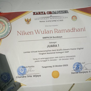 Niken Wulan Ramadhani Kelas 7A Juara 1 virtual Nasional keterampilan seni grafis desain poster digital. Tingkat Nasional Pihak penyelenggara karya